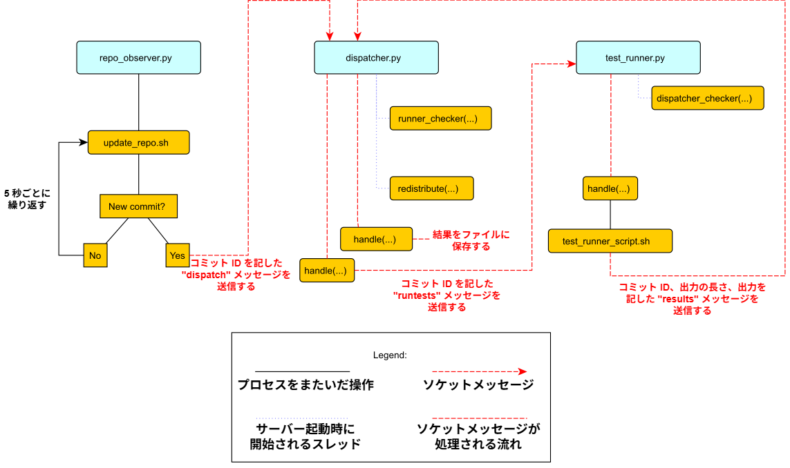 この CI システムの概観図を図 1 に示す。この図では新しいコミットが作成されるとき三つのファイル (repo_observer.py, dispatcher.py, test_runner.py) が全て実行されているものと仮定されている。