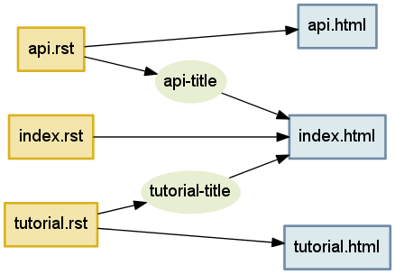 Sphinx は tutorial.html のタイトルを新しいものに置き換え、さらに index.html の目次にも新しい章題を出力する。この例で Sphinx は整合性の取れた出力を生成するために必要な処理を全て行っている。