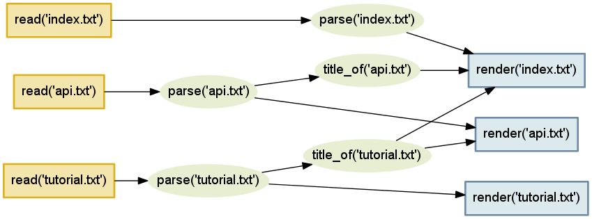 成功だ! tutorial.txt に関するタスクだけが再実行された。title_of は変更された入力ドキュメントを受け取っても以前と同じ値を返すので、title_of を利用する他のタスクは再実行されない。