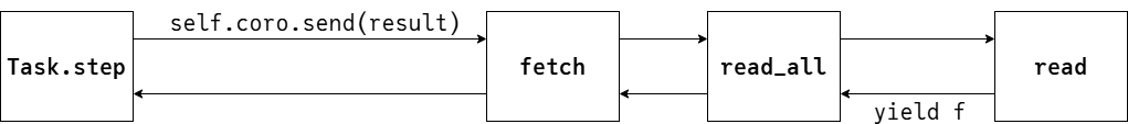 コールバックベースのプログラムに存在した Fetcher クラスはもはや必要ない。Fetcher はコールバックの欠点によって生まれたクラスと言える: ローカル変数は関数が返ると使えなくなるので、I/O を待機するとき状態を格納する場所が必要だった。これに対してコルーチンの fetch は状態を通常の関数と同じようにローカル変数に格納できるので、クラスは用済みとなる。