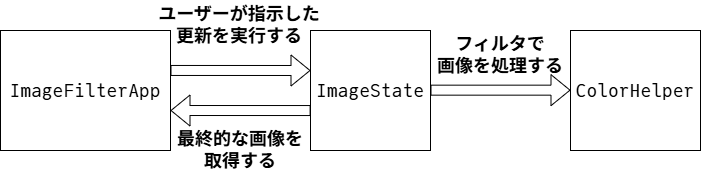 これまでに説明してきたクラスを一つのアプリケーションにまとめるクラスが ImageFilterApp である。アプリケーションのコードは多くがレイアウト関係のコードなので、ユニットテストが難しい。そのため、このクラスは可能な限り小さいことが望ましい。ただ、これまでアプリケーションの機能の多くをテスト付きの独立したクラスに収めてきたので、重要な部分は正しく動作すると自信を持つことができる。