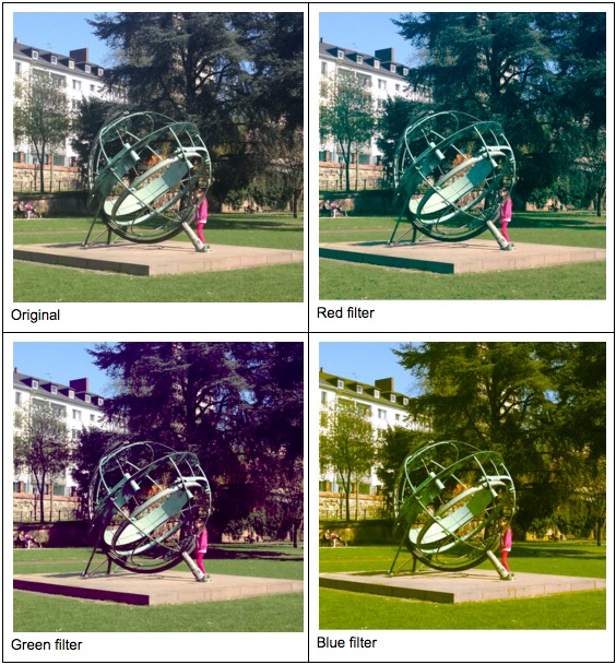 この事実に私が落胆したと思ったかもしれない。しかし、このときまでに私は以前に知らなかった ── 色空間やピクセル操作に関する ── 様々な事項を学んでいた。そこで、次は部分的に色が付いたクールな画像を作ることにした。ロンドンの絵葉書で見かけることのある、バスや公衆電話ボックスだけが赤くなっていて、他の部分は白黒の写真のような画像である。