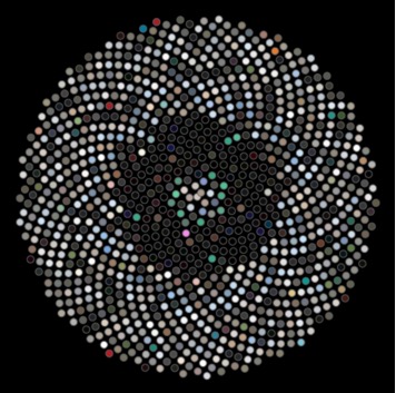 しかし、私は画像の支配色 (dominant color, ドミナントカラー) を計算する方法を知らなかった。画像を 1x1 に縮小したときの色を使う方法も考えたものの、正しい方法でない気がした。ただ、画像をどのように並べたいかは分かっていた: sunflower layout と呼ばれるレイアウトである。sunflower layout を使うと、複数の円を最も効率良く並べることができる。