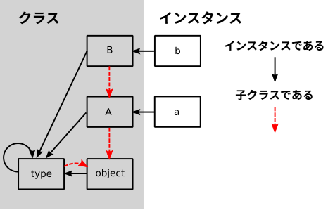 クラス自体もオブジェクトの一種なので、クラスは (間接的に) Base を継承する。そのため、クラスは何らかのクラスのインスタンスである必要がある: このクラスをメタクラス (metaclass) と呼ぶ。