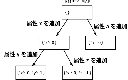 二つ目の assert から、p1 が持つマップの attrs 属性は辞書 {"x": 0, "y": 1} だと分かる。これは、このインスタンスが二つの属性を持ち、それらの名前が "x" と "y" であり、それぞれの値はインスタンスが持つストレージ storage の位置 0 および 1 に格納されることを意味する。インスタンス p2 を新しく作って同じ二つの属性を同じ順番で追加すると、同じマップがインスタンスに関連付けられる。一方で、p3 のように異なる属性が追加されたなら当然マップは共有されない。