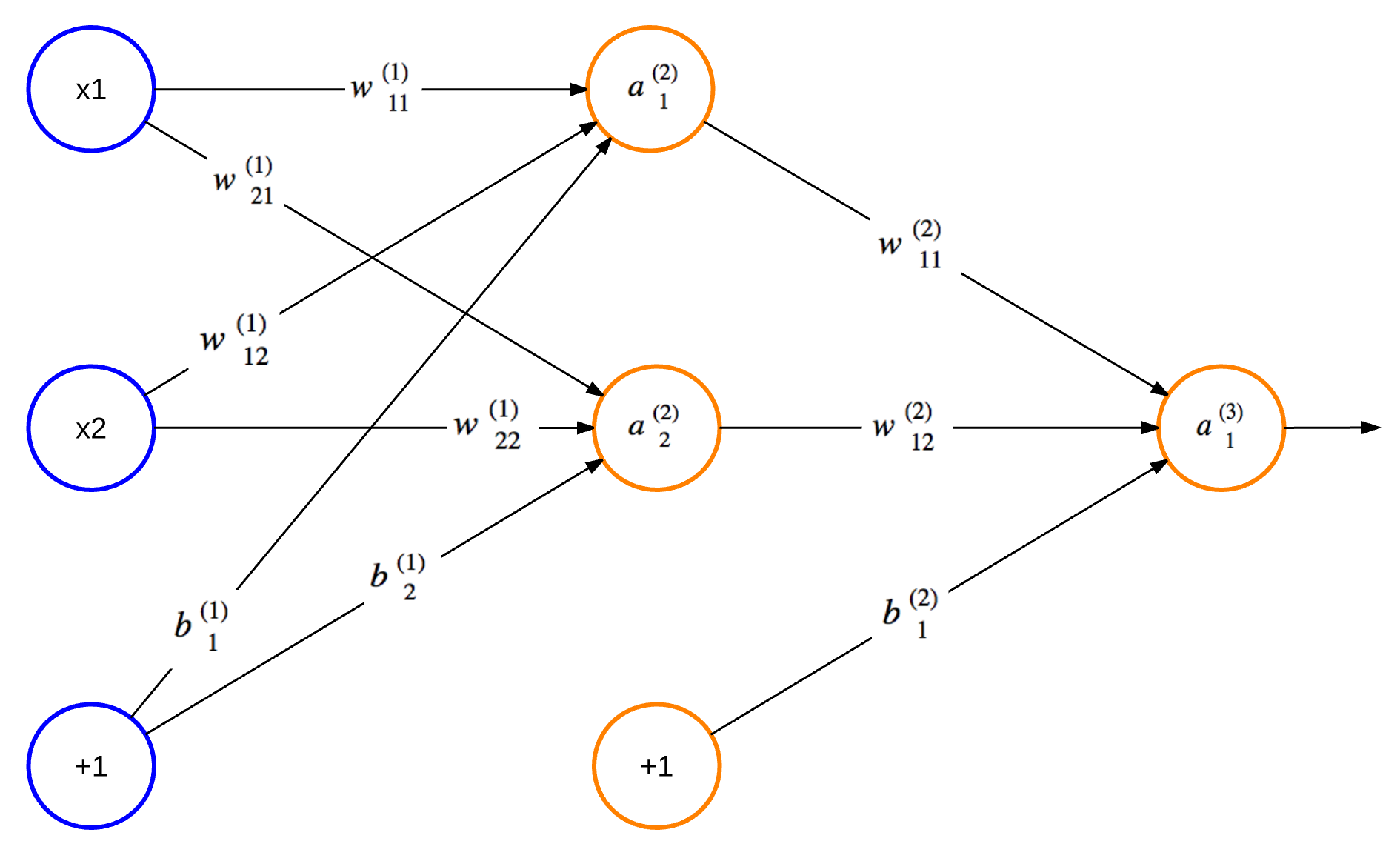 ANN は情報をやり取りする相互接続されたノードからなるネットワークであり、その構造と機能は実際の生物の脳に存在する神経ネットワークに着想を得ている。Hebbian Theory は、そういったネットワークが自身の構造や接続の強さを物理的に変化させることで特定のパターンを認識できるように学習する仕組みを説明する。同様に、典型的な ANN (図 1) はノードの接続が重みを持ち、ネットワークが学習を進めると重みが更新される。「+1」と書かれたノードはバイアス (bias) と呼ばれる。左端にある青い丸が入力ノード (input node) を表し、中央にあるオレンジ色の丸が隠れノード (hidden node) を、右端にあるオレンジ色の丸が出力ノード (output node) を表す。隠れノードの列がいくつも存在する ANN も可能であり、隠れノードの列全体を隠れ層 (hidden layer) と呼ぶ。