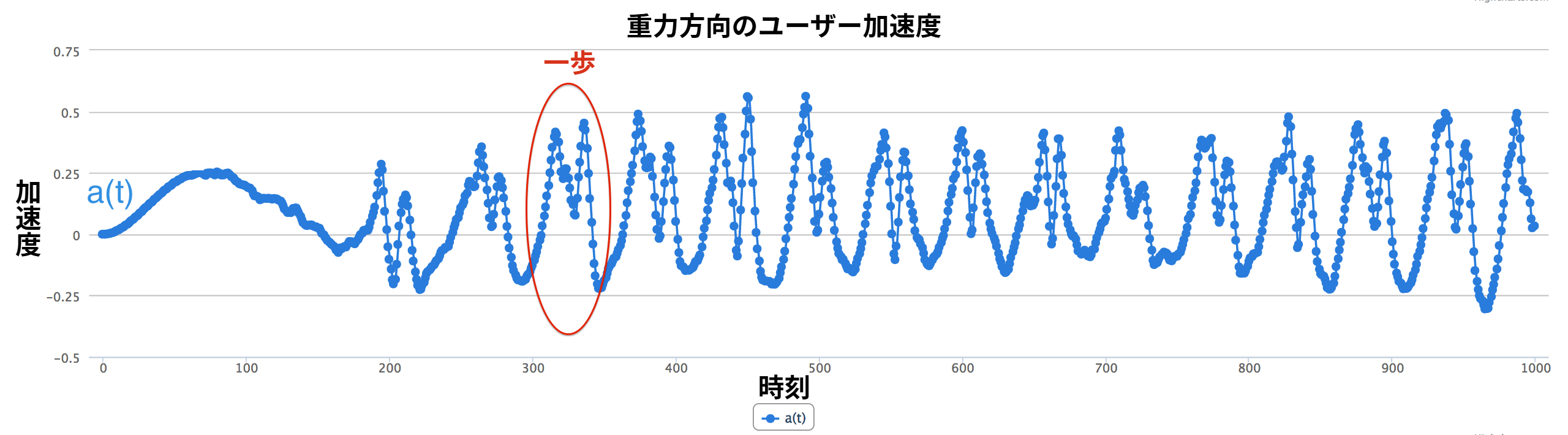 歩数を測定するには、ユーザーの移動が原因で生じる重力方向の加速度に注目する必要がある。そのため、加速度計から得られる三次元の加速度信号 (図 4) から重力方向のユーザー加速度を集めた時系列を抽出しなければならない。