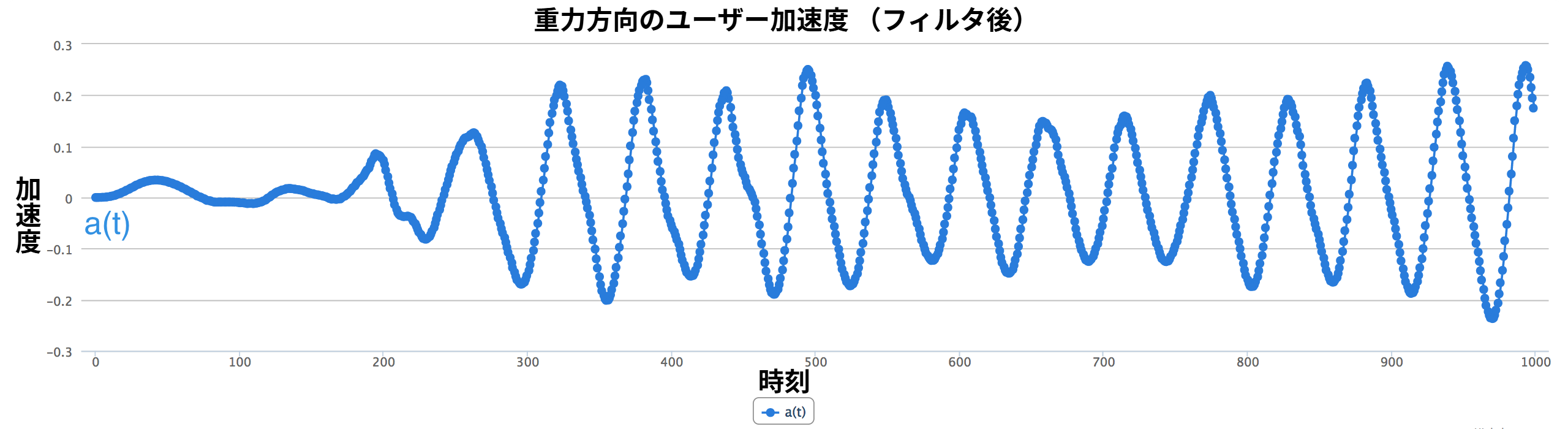- \((x_{u}(t), y_{u}(t), z_{u}(t))\) と \((x_{g}(t), y_{g}(t), z_{g}(t))\) の内積を取り、重力方向のユーザー加速度 \(a(t)\) を得た。