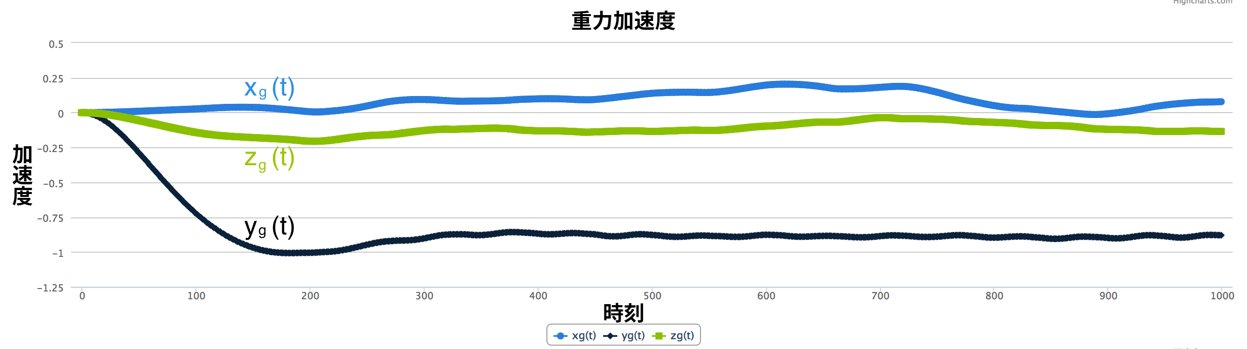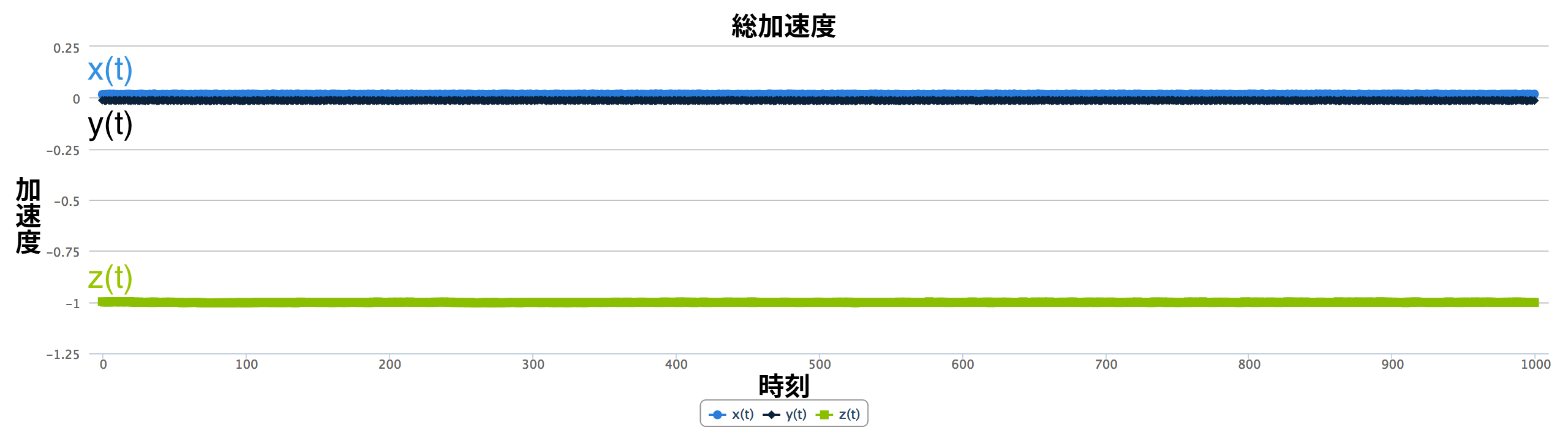 \(x(t)\) と \(y(t)\) は \(0\) で一定なのに対して、 \(z(t)\) は \(-g\) で一定なことに注目してほしい。この加速度計は重力加速度を含めた全ての加速度を記録している。