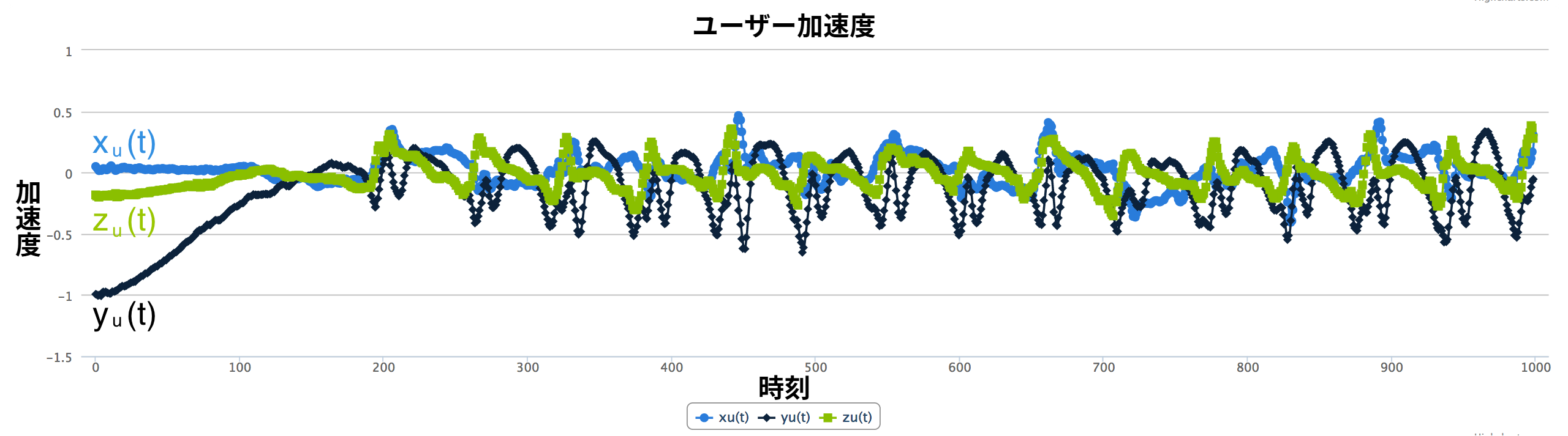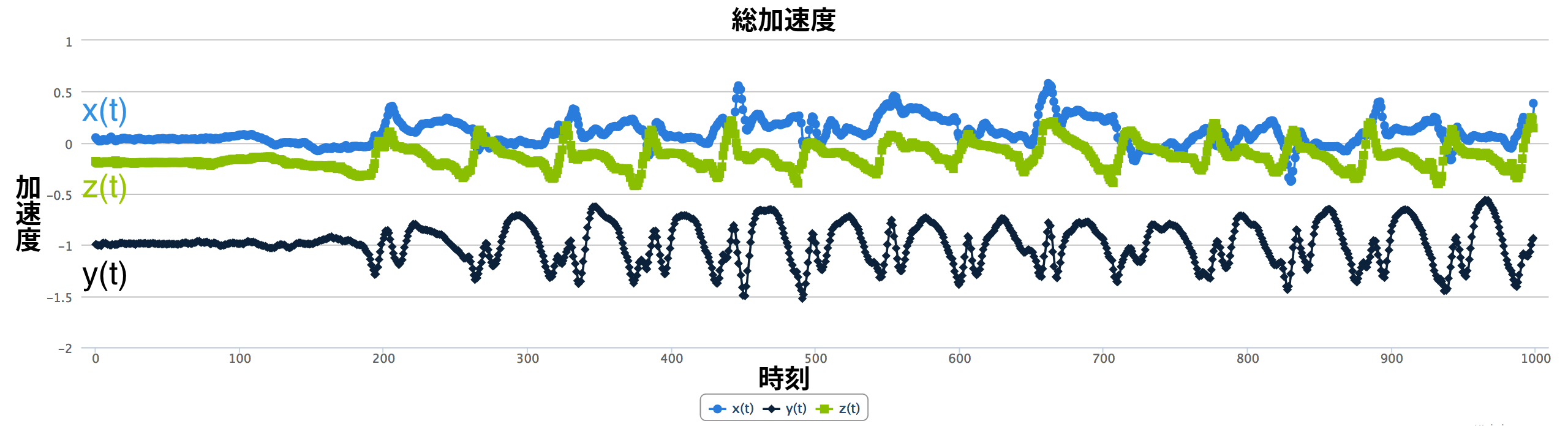 加速度計から得られる三つの時系列はそれぞれ各方向の総加速度 (total acceleration) を表す。総加速度はユーザー加速度 (user acceleration) と重力加速度 (gravitational acceleration) の和である。