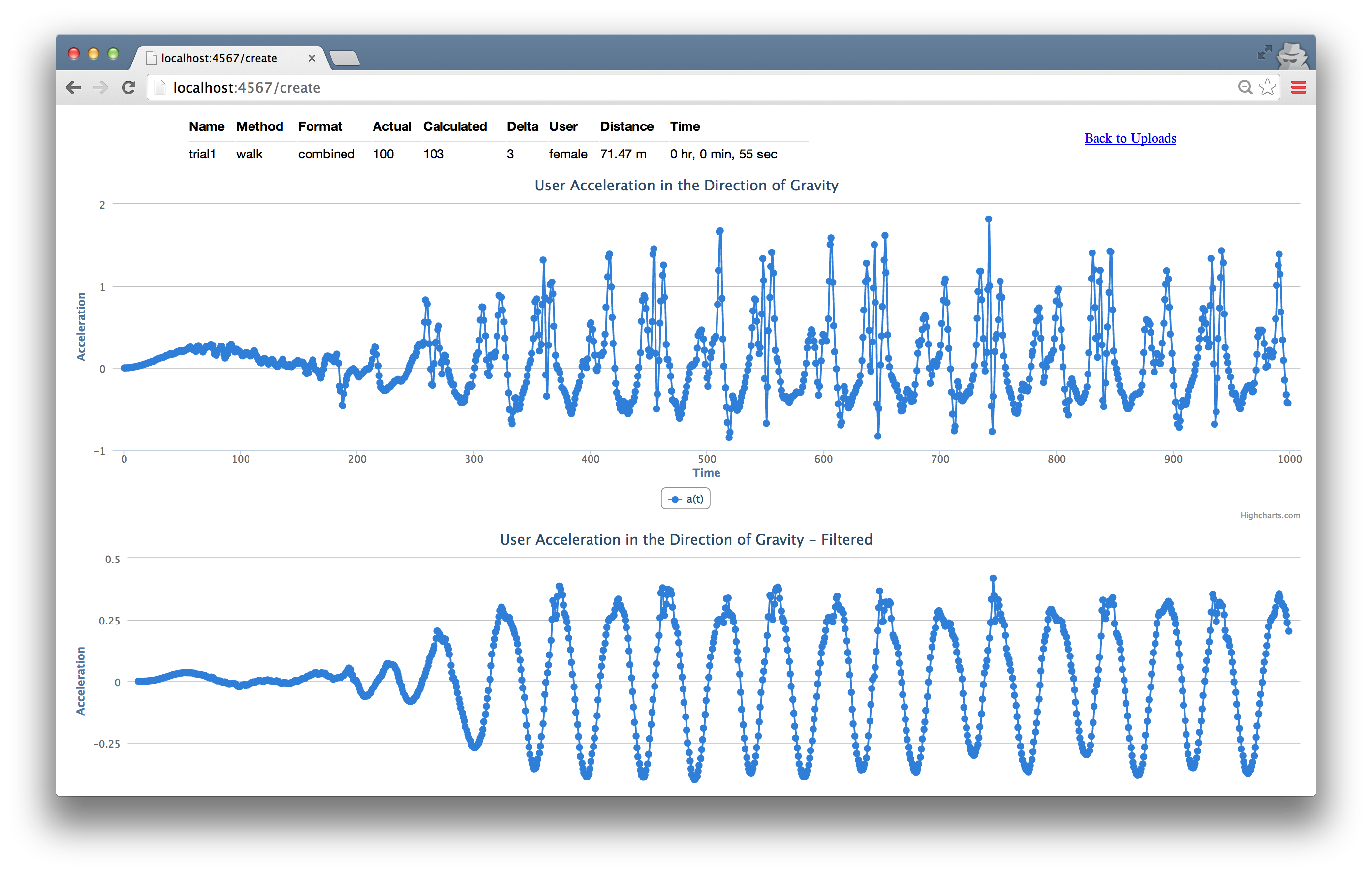 ユーザーが /uploads にアクセスしてウェブアプリケーションを開始すると、既存のデータを示す表と新しいデータを送信するためのフォームを目にする。送信できるデータは加速度計が出力したファイルと歩行試行データ、そしてユーザー情報である (図 18)。