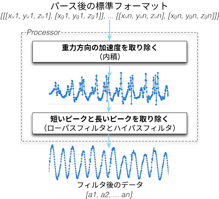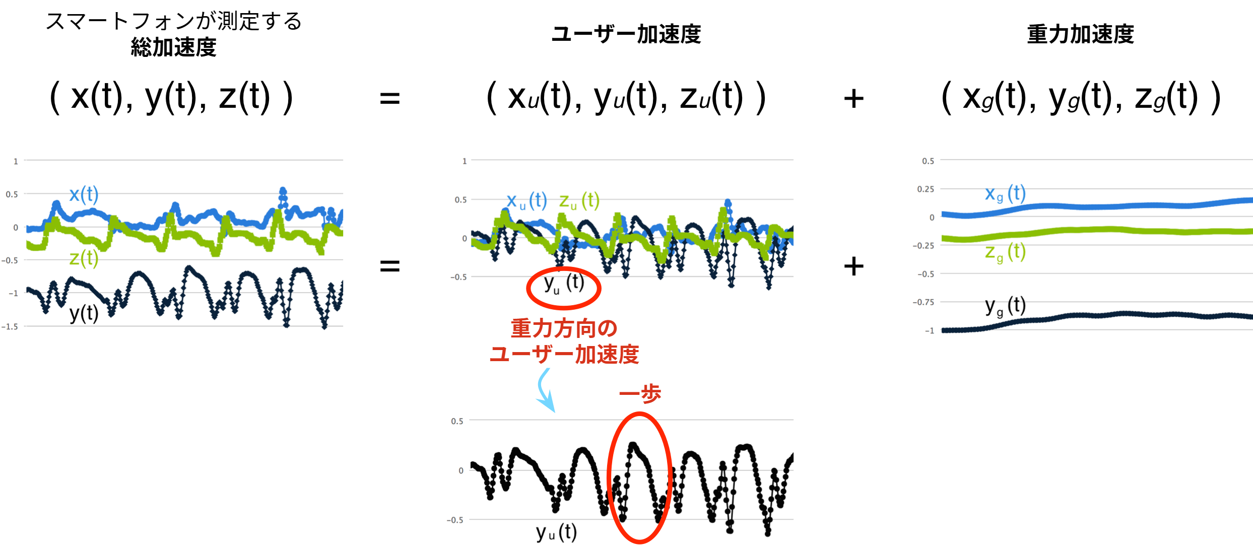 - ローパスフィルタを使って総加速度をユーザー加速度 \((x_{u}(t), y_{u}(t), z_{u}(t))\) と重力加速度 \((x_{g}(t), y_{g}(t), z_{g}(t))\) に分割した。
