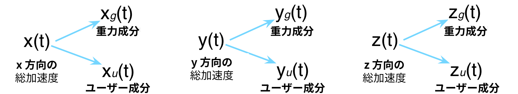 - 最初に与えられるのは総加速度 \((x(t), y(t), z(t))\) だった。