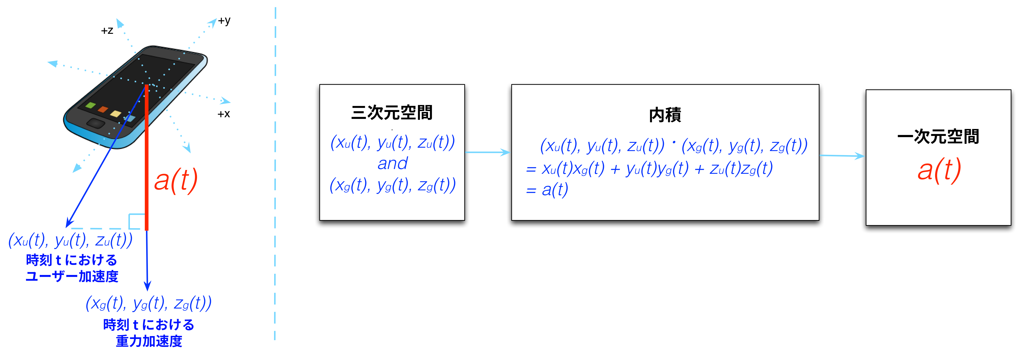 内積を使うと三次元空間から一次元空間にデータを移すことができる。具体的には、ユーザー加速度と重力加速度という二つの三次元時系列の内積を取ると、重力方向のユーザー加速度成分を表す一次元の時系列が得られる (図 10)。この時系列をこれから \(a(t)\) と呼ぶ。重要な時系列には名前を与えてしかるべきだからである。