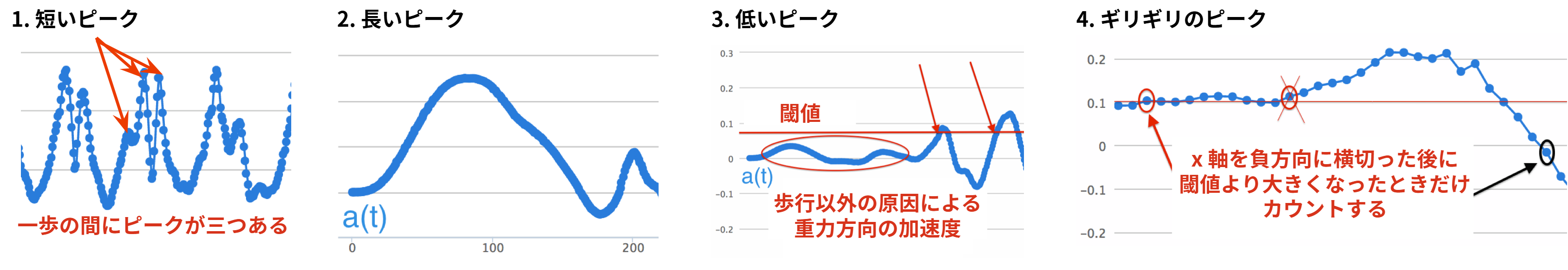 ユーザーがスマートフォンのアプリを使っていたり通話していたりすると、加速度計は重力方向に小さな動きを記録し、時系列上に低いピークが現れる。こういった低いピークを除去するには、\(a(t)\) が事前に設定した閾値を下から上に通り過ぎたときにだけピークを検出するようにすればよい。