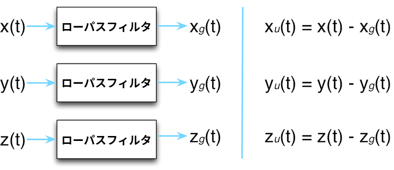 よって、総加速度をローパスフィルタに通せば重力加速度だけが残る。そして総加速度から重力加速度を引けばユーザー加速度が得られる。この操作は \(x\), \(y\), \(z\) 方向のそれぞれに対して実行できる (図 7)。