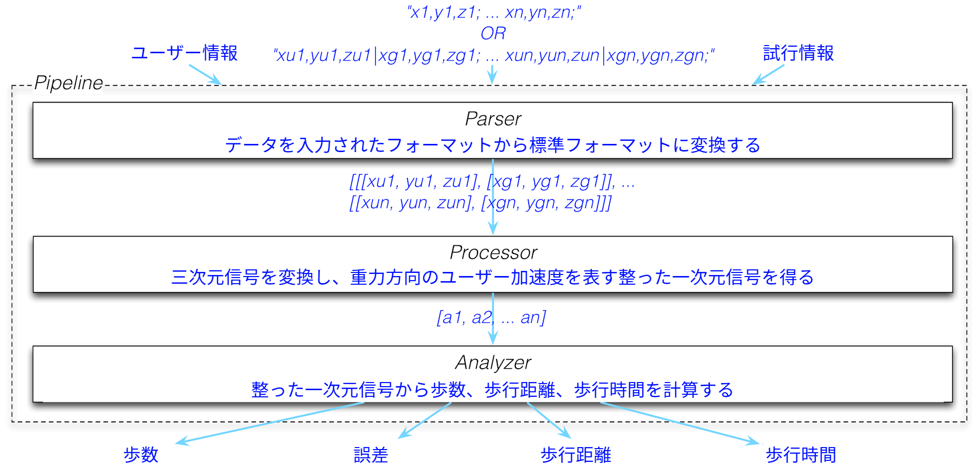 Parser, Processor, Analyzer クラスはそのままでも利用できるものの、一つにまとめた方が間違いなく使いやすい。これらのクラスを利用する他のプログラムは先述したパイプラインを実行することが多いので、Pipeline クラスを用意する: