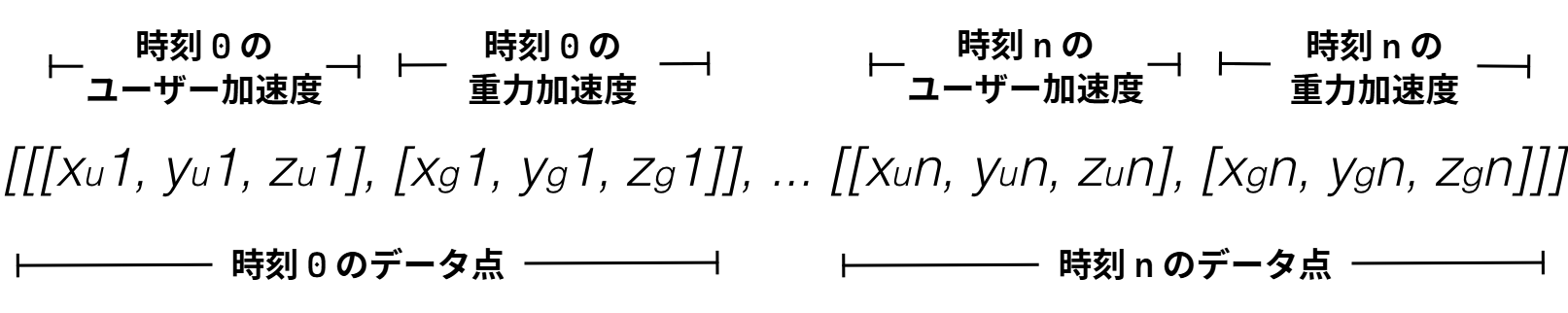 加速度計は三次元の信号 (signal) を返す。信号は特定の時間に集計されたデータ点の集合である。信号の各要素は時系列であり、それぞれが \(x\), \(y\), \(z\) 方向の加速度を表す。この時系列の各点は特定の時刻における対応する方向の加速度を表す。加速度は「\(\mathrm{G}\)」を一単位として測定される。\(1~\mathrm{G}\) は地球の重力加速度の平均値 \(9.8~\mathrm{m/s^2}\) に等しい。