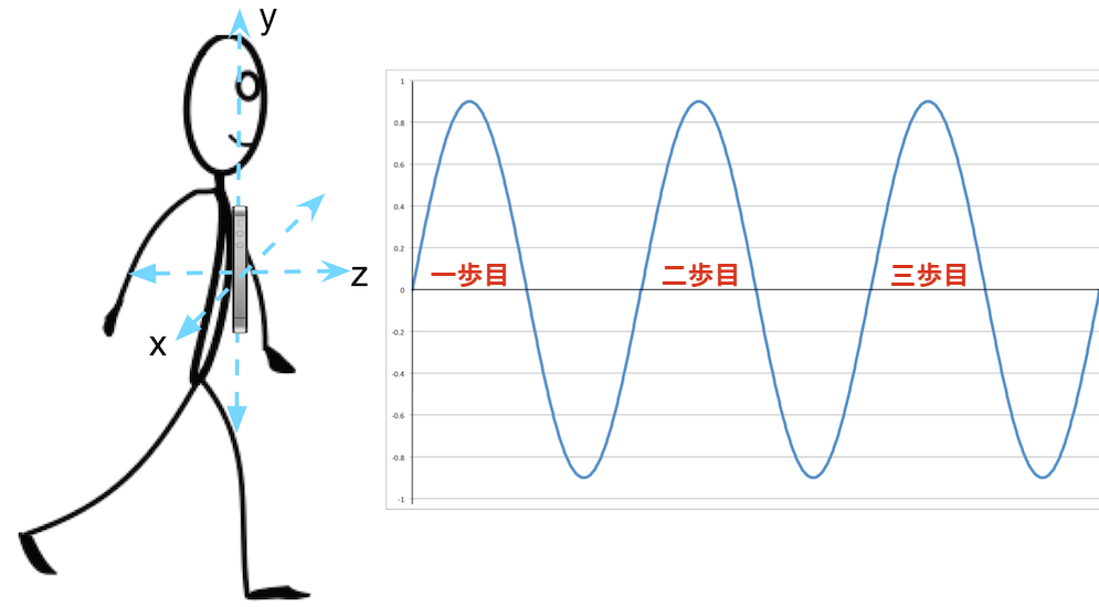 私たちが仮定する完璧な世界では、歩行による上下の加速度は \(y\) 方向の完全なサイン波を描く。このサイン波の一周期がちょうど一歩に対応するので、歩数を測定するには加速度の最大値を検出すればよい。