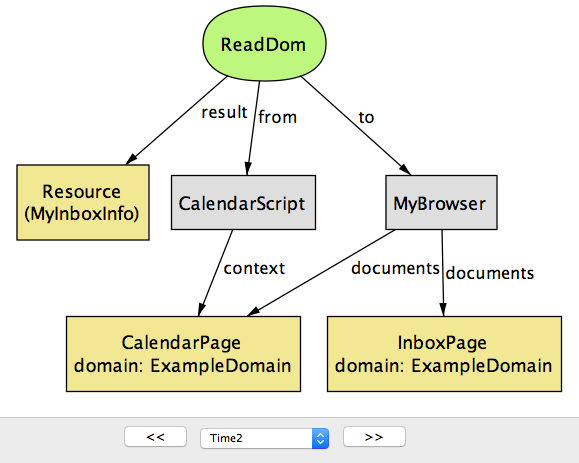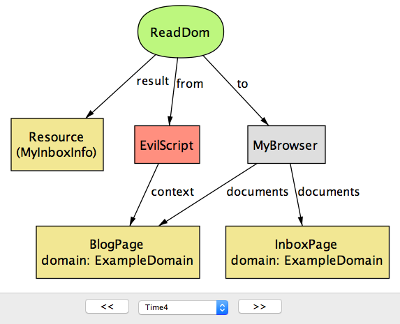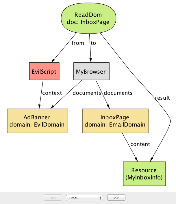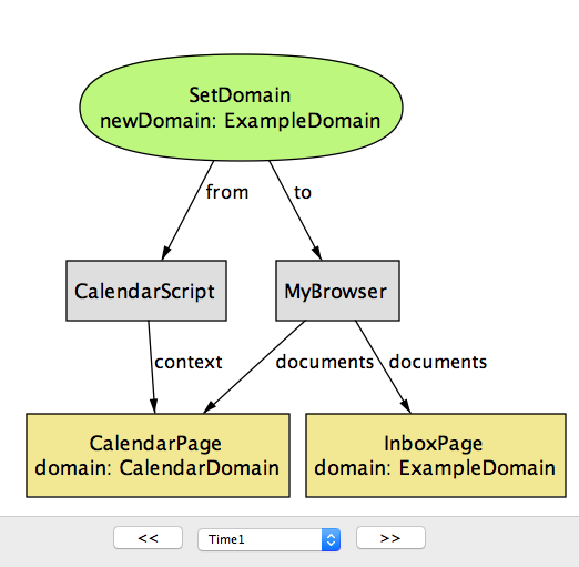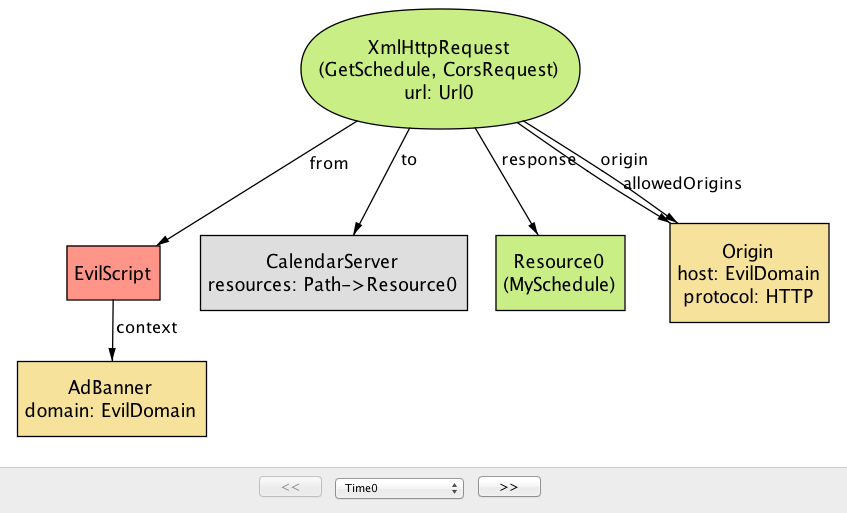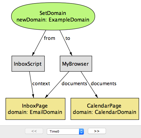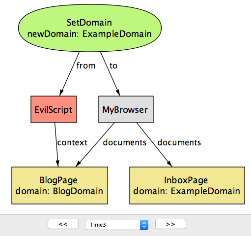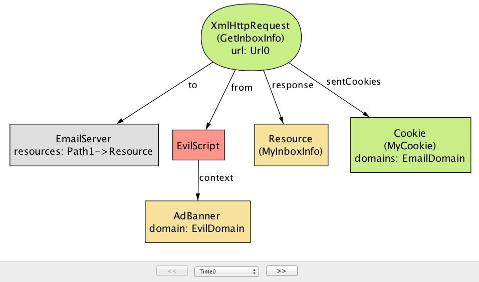 Time に関して特別なことは何もない点に注目してほしい: Step や State のような別の名前を付けたとしても、モデルの振る舞いは全く変わらない。関係に新しい列を追加してシステム実行中の異なる時点におけるフィールドの値を表現する手段を追加しているだけに過ぎない。例えば Browser シグネチャの cookies フィールドに対応する関係は Time の列を最後に持つ。この意味で、Time オブジェクトはインデックスとして使われるヘルパーオブジェクト以外の何物でもない。