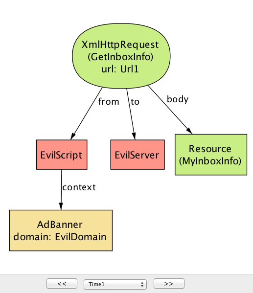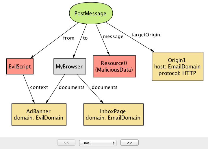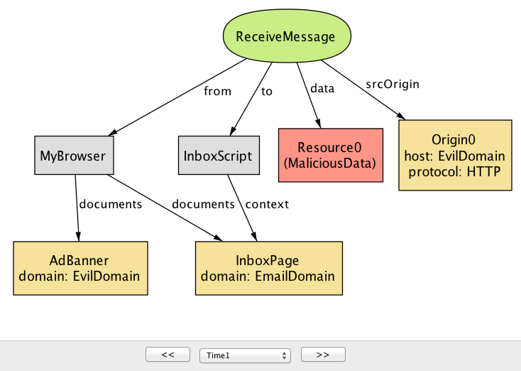 デフォルトで postMessage の仕組みは誰が postMessage を送信できるかを制限しない点に注目してほしい。言い換えれば、ReceiveMessage ハンドラを登録済みのドキュメントに対しては任意のドキュメントから postMessage を送信できる。Alloy Analyzer が生成した反例インスタンス (図 7a) では、AdBanner 内で実行される EvilScript が悪意ある PostMessage を EmailDomain 宛てに送信する。