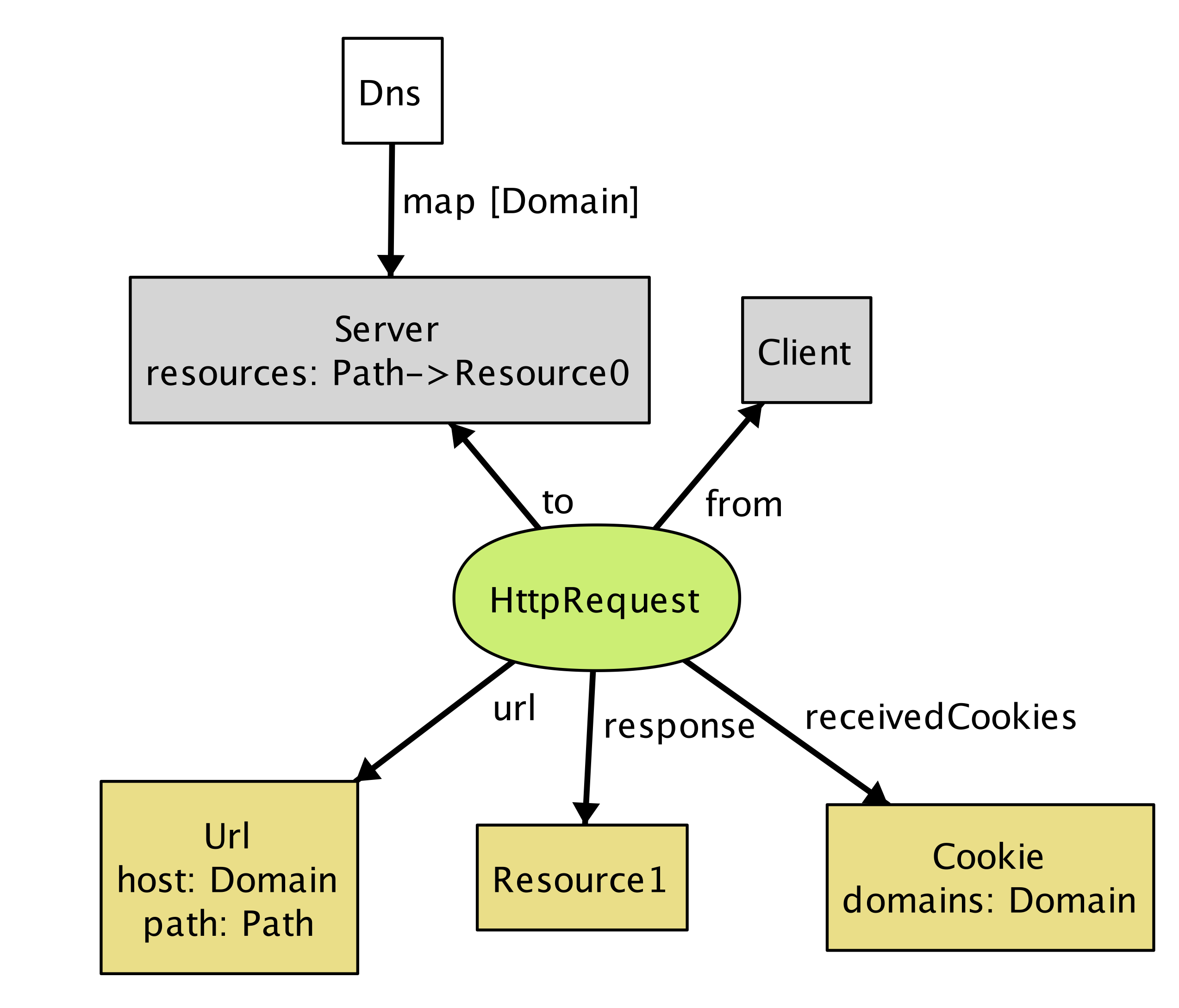 HttpRequest の定義では、フィールドに続いて制約 (constraint) の集合が定義される。ここにある二つの制約は HTTP リクエストの集合に属する任意の要素に適用され、それぞれ「任意のリクエストはクライアントが送信する」そして「任意のリクエストは DNS マッピングで URL のホストに対応するサーバーのいずれかに送信される」を表す。