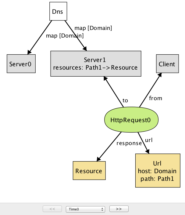 このインスタンスは詳細の多くを省略した非常に小さなものであるにもかかわらず、私たちのモデルが持つ問題を一つ明らかにしている。リクエストに対する返答 (Resource1) がサーバーに存在していない点に注目してほしい。サーバーに関する明らかな事実を指定し忘れている: 任意のリクエストに対する返答はサーバーが保持するリソースでなくてはならない。HttpRequest の定義に次の制約を追加しよう: