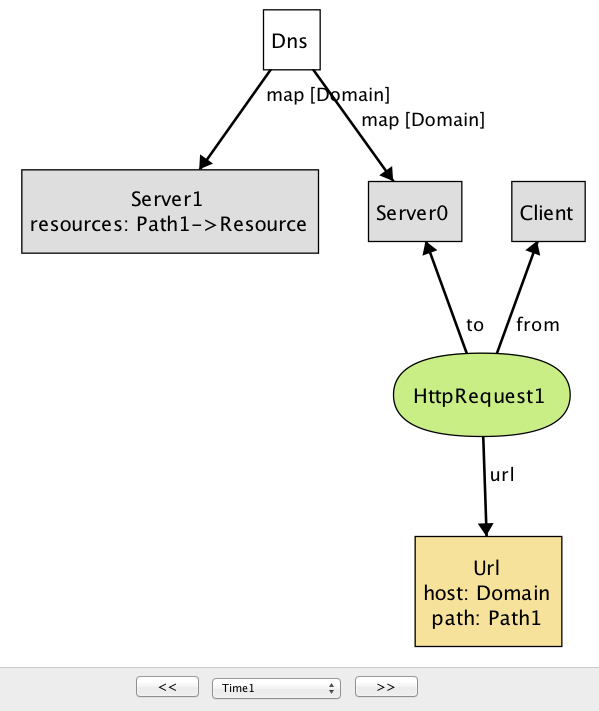 この反例ではクライアントが送信する HTTP リクエストが二つ示されており、それぞれ送信先のサーバーが異なる。Alloy がインスタンスを描画するとき、同じシグネチャを持つオブジェクトは数値を後ろに付けることで区別される (オブジェクトが一つしかない場合は何も付かない)。この反例の図に示された文字列はオブジェクトの名前を表す。そのため ── 最初は困惑するかもしれないが ── 図中の Domain, Path, Resource, Url といった文字列はシグネチャではなくオブジェクトの名前を表す。