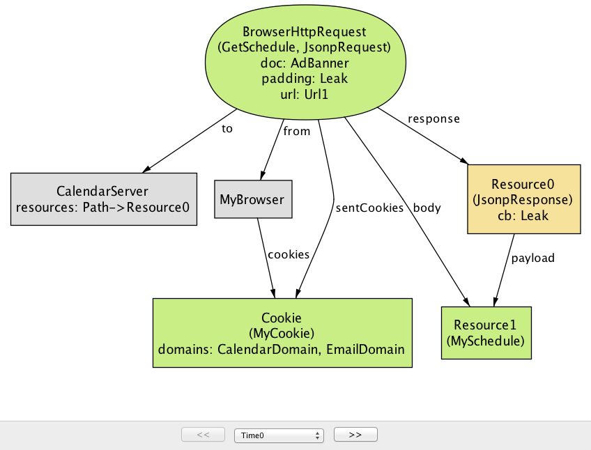 解析: Alloy Analyzer で機密性プロパティ Confidentiality を検査すると、JSONP の潜在的なセキュリティリスクを示す反例が生成される (図 6a)。このシナリオでは、カレンダーアプリケーション (CalendarServer) が JSONP エンドポイント GetSchedule を通してサードパーティからリソースを利用可能にしている。リソースに対するアクセスを制限するために、CalendarServer はリクエストにユーザーを識別するクッキーが含まれる場合にのみユーザーのスケジュールを持ったレスポンスを送り返す。