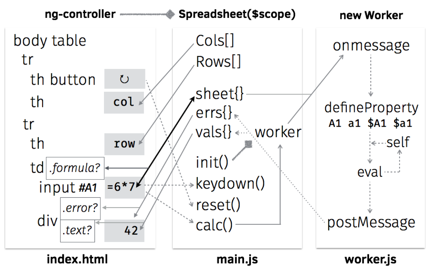 body 要素の開始タグに付いている ng-app 属性と ng-controller 属性は、500lines モジュールの Spreadsheet 関数を実行するよう AngularJS に伝える。Spreadsheet 関数はモデル (model) と呼ばれるオブジェクトを返し、このモデルがドキュメントのビュー (view) に対するバインディングを提供する。ng-cloak 属性はバインディングが作成されるまでドキュメントを表示しないよう指示する。