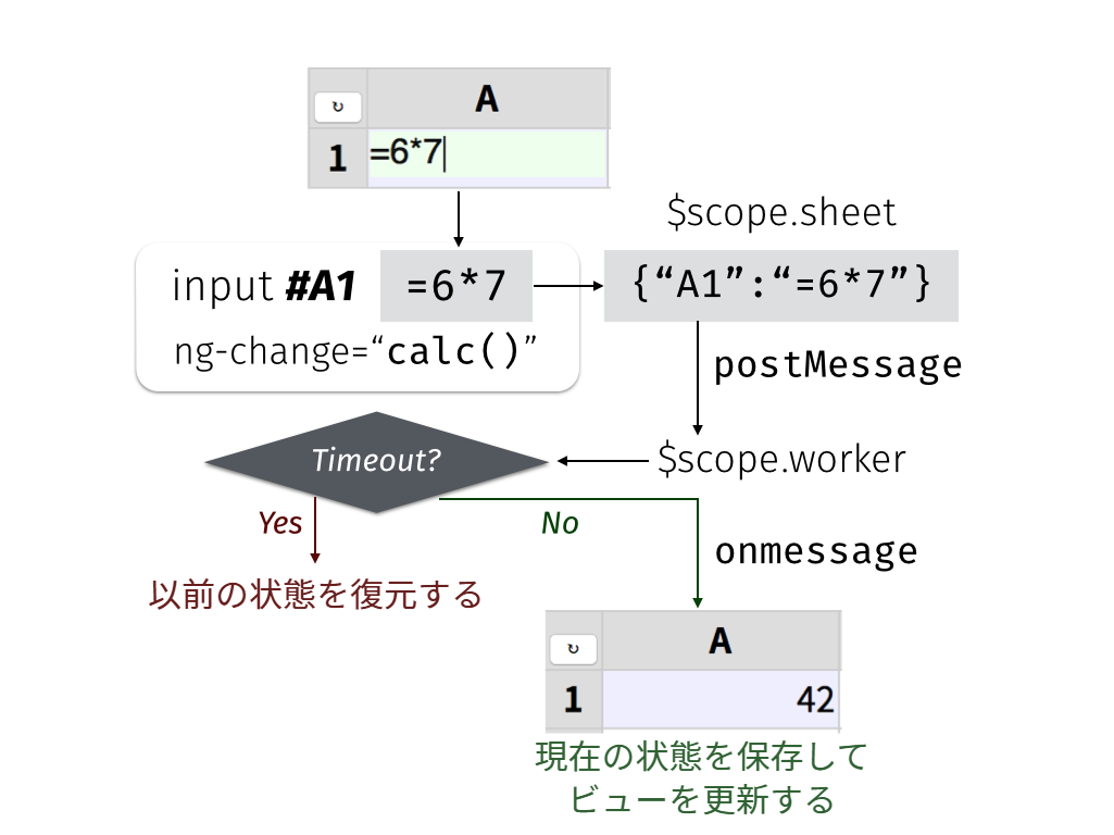 alert()でダイアログボックスを出すといった親ページに対する干渉が数式から可能になる。 - 数式は任意のセルを座標で参照できる。参照されるセルの数式も他のセルを参照できるので、循環参照が作成される可能性がある。この問題を解決するために、ワーカーのグローバルスコープオブジェクト