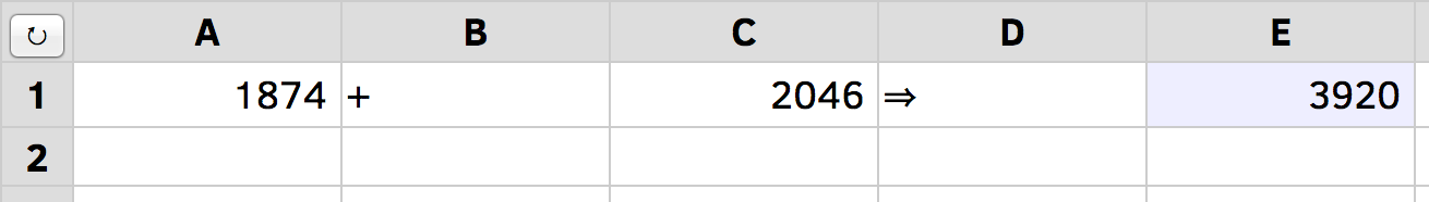 E1の=A1+C1など。数式は評価され、評価結果 (この例では3920) に置き換えられる。薄い青色の背景で表示される。 - 空: 上記の例で第