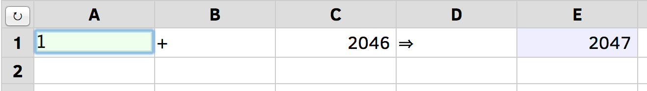 A1 にフォーカスを移動してコンテンツを 1 に変更すると E1 の数式が再計算され、E1 に表示される数値が更新されて 2047 となる (図 3)。
