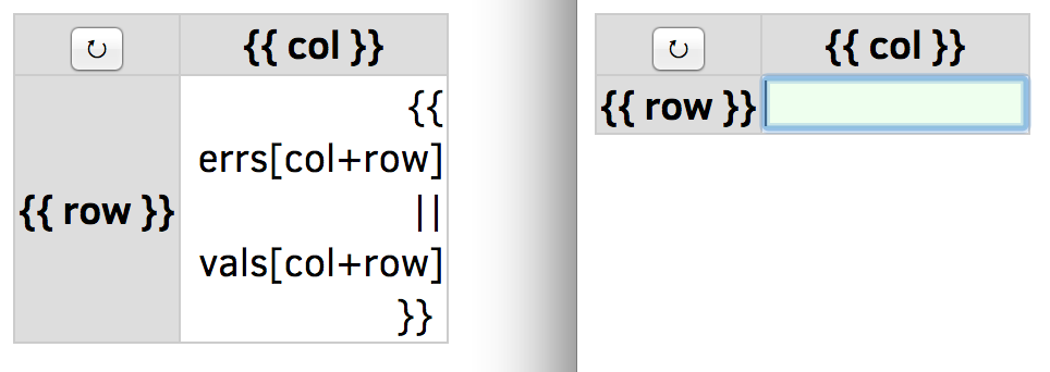 数式セルの評価でエラーが発生した場合は errs[col+row] に含まれるエラーメッセージが補間される。さらに ng-class が要素に error クラスを割り当てるので、CSS による異なるスタイルの適用が可能になる (赤い文字で中央寄せなど)。
