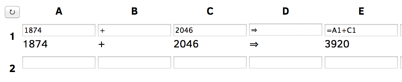 Ctrl+R または Cmd+R を押してページをリロードすると、スプレッドシートの内容が永続化されているのが分かる。つまりブラウザセッションをまたいで同じ内容を表示できる。スプレッドシートを最初の状態にリセットする処理は、左上にある円状矢印ボタンを押すと実行できる。
