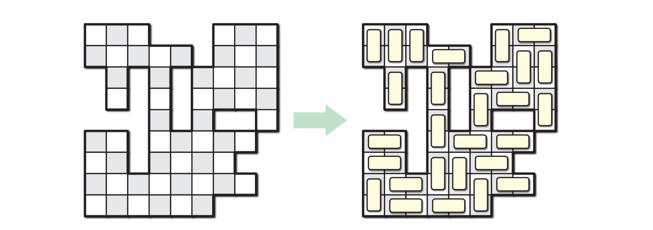 図 11.10穴の開いたチェッカーボードをドミノで埋める入力は \(\mathit{Deleted}[i..n,i..n]\) であり、\(\mathit{Deleted}[i,j] = \textsc{True}\) は \(i\) 行 \(j\) 列目のマスが取り除かれていることを表します。出力は一つの真偽値であり、ドミノの実際の配置を計算する必要はありません。例えば上図のボードに対するアルゴリズムの答えは \(\textsc{True}\) です。