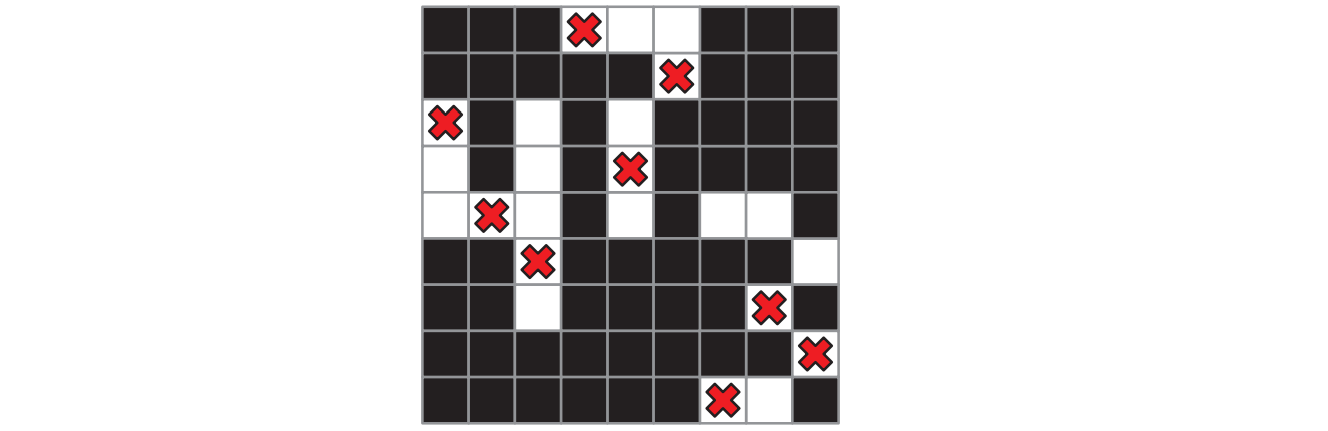 入力はどのマスが白いかを表す真偽値の二次元配列 \(\mathit{IsWhite}[1..n, 1..n]\) であり、出力は真偽値一つです。例えば以下の格子が与えられたときのアルゴリズムの答えは \(\textsc{True}\) です。