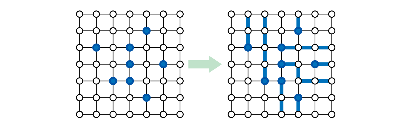 \(n \times n\) の格子が与えられ、いくつかのマスに印が付いているとします。つまり真偽値の配列 \(M[1..n, 1..n]\) によって格子が表され、\((i, j)\) というマスに印が付いているときに限って \(M[i,j] = \textsc{True}\) ということです。単調路 (monotone path) とは、格子の左上のマスから右下のマスへの路であって各ステップにおいて左または下にしか移動しないものを言います。この問題の目標は、印の付いた全てのマスをなるべく少ない単調路で被覆することです。