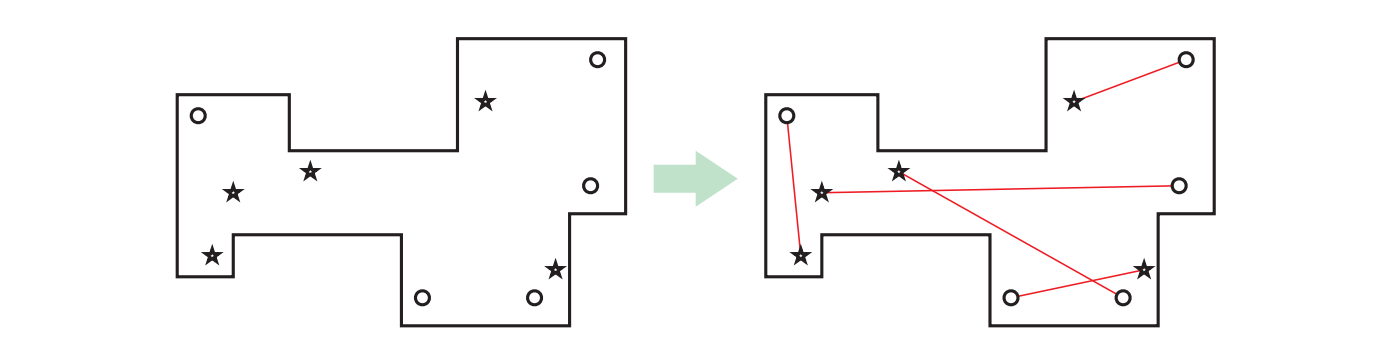 図 11.9\(5\) 個のスタート地点 (*) とゴール地点 (○) を持つミニゴルフコース、そして条件を満たすスタートとゴールの対応関係 -