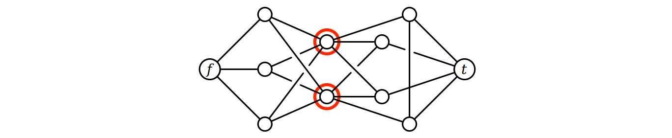 入力グラフ \(G\) が辺だけではなく頂点にも容量を持つとします。この設定では関数 \(f: E \rightarrow \mathbb{R}_{\geq 0}\) がフローであるための条件に新しい制約が加わります。その制約とは、\(s, t\) 以外の全ての頂点 \(v\) について \(v\) に入るフローの和が非負の定数 \(c(v)\) 以下でなければならないというものです (保存条件からこの値は \(v\) から出るフローの和と等しくなります): \[ \sum_{u \rightarrow v} f(u \rightarrow v) \leq c(v) \] この新しい制約があったとしても最大フローを計算できるでしょうか?