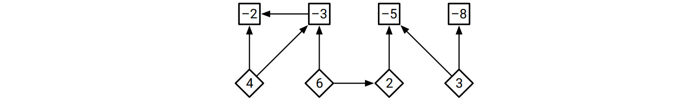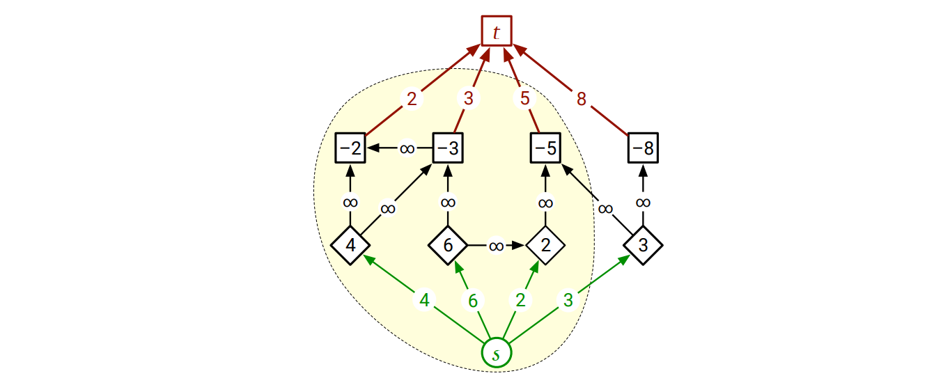 抽象的に考えると、この問題の答えはプロジェクトの集合の二つの部分集合への分解、つまり選択するプロジェクトの集合 \(S\) と選択しないプロジェクトの集合 \(T\) への分解と捉えることができます。そのため、何らかのグラフにおける最小カットとしてこの問題をモデル化すれば良いのではないかという気がします。でもどんなグラフでしょう? 依存関係を表現するにはどうすれば? ここで行いたいのは利益の最大化ですが、私たちが求められるのは最小カットだけです。どうすれば? 負の利益を正の容量に変換するにはどうすればいいのでしょうか?