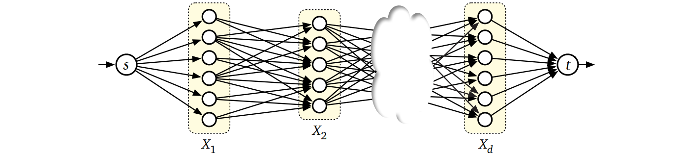 \(G\) には全ての \(w \in X_{1}\) に対して容量 \(1\) の辺 \(s \rightarrow w\) があり、全ての \(z \in X_{d}\) に対して容量 \(1\) の辺 \(z \rightarrow t\) が存在ある。そして全ての添え字 \(i\) に対して全ての \(x \in X_{i}\) と \(y \in X_{i+1}\) の間に容量 \(c(x,y)\) の辺 \(x \rightarrow y\) がある (\(c(x,y)=0\) である辺 \(x \rightarrow y\) は存在しないとしてもよい)。