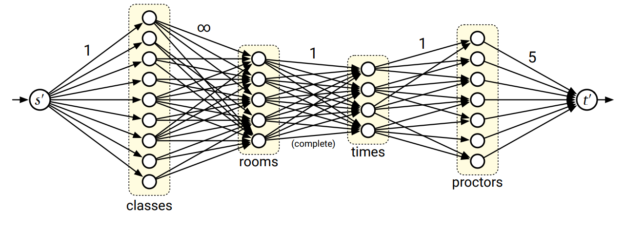 \(G\) における \(s^{\prime}\) から \(t^{\prime}\) への路は、一つの期末試験に対する制約を満たす講義、教室、時間帯、試験監督の組を表します。つまり講義を取っている全ての生徒は教室に収まり、試験監督はその時間帯に試験を監督できるということです。逆に正しい (講義、教室、時間帯、試験監督の) 組には対応する \(s^{\prime}\) から \(t^{\prime}\) への路が \(G\) に存在します。よって行う試験の数を最大化するような制約を満たすスケジュールを構築するには、まず \(G\) における最大 \((s^{\prime},t^{\prime})\)-フローを計算して、それから最大フローに含まれる路を講義、教室、時間帯、試験監督の組に変換すれば良いことになります。もし \(|f^{\ast}| = n\) ならば計算されたスケジュールを返し、そうでなければ \(n\) 個の期末試験を行うスケジュールが不可能だと正しく報告します。
