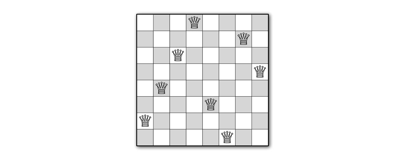 \(n\) クイーン問題とは、\(n \times n\) のチェス盤に \(n\) 個のクイーンをお互いを攻撃できないように置くという問題です。チェスを知らない読者のために言っておくと、クイーンがお互いを攻撃できないとは、どのクイーンも同じ列、行、対角線上に無いことを意味します。