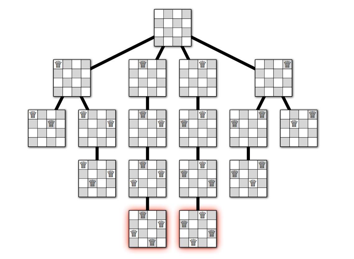 \(\textsc{PlaceQueens}\) の実行は再帰木 (recursion tree) を使って可視化できます。再帰木の頂点は再帰的に呼ばれる小問題に対応し、このアルゴリズムでは制約を満たす部分解を表します。再帰木の根は何も配置されていない盤 (\(r = 0\)) を、辺は再帰呼び出しを、葉はクイーンをそれ以上配置できない部分解を表します。クイーンが配置できない理由は全ての列にクイーンが配置されているためか、そうでなければ空の列の全てのマスがそれまでに配置されたクイーンから攻撃されるためです。バックトラッキングを使った完全な解の探索はこの木に対する深さ優先探索と同じ動きをします。