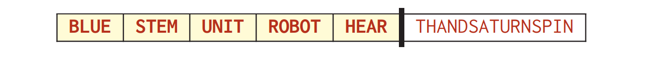 まず明らかなのは、複数の方法で分割できる文字列もあるということです。例えば \(\color{maroon} \texttt{BOTH} \)\( \color{maroon} \texttt{EART} \)\( \color{maroon} \texttt{HAND} \)\( \color{maroon} \texttt{SATU} \)\( \color{maroon} \texttt{RNSPIN}\) は \(\color{maroon} \texttt{BOTH} \cdot {} \)\( \color{maroon} \texttt{EARTH} \cdot {} \)\( \color{maroon} \texttt{AND} \cdot {} \)\( \color{maroon} \texttt{SATURN} \cdot {} \)\( \color{maroon} \texttt{SPIN}\) にも \(\color{maroon} \texttt{BOT} \cdot {} \)\( \color{maroon} \texttt{HEART} \cdot {} \)\( \color{maroon} \texttt{HANDS} \cdot {} \)\( \color{maroon} \texttt{AT} \cdot \texttt{URNS} \cdot {} \)\( \color{maroon} \texttt{PIN}\) にも分割できますし、他にも分割方法があります。しかしまずは、一番単純な問題「入力の文字列を英単語ごとに分割する方法は一つでも存在するか?」を考えることにします。