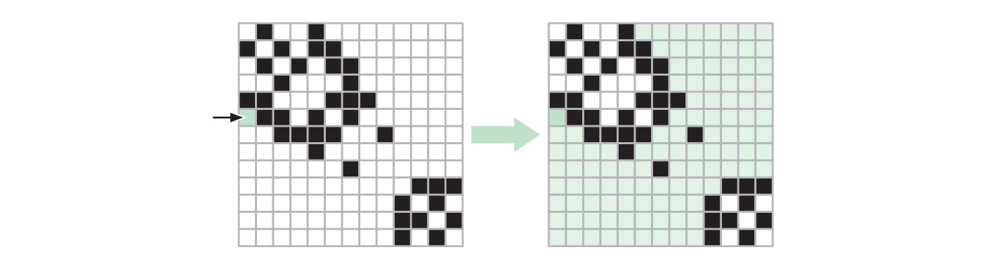 何か優先探索の現代的な例のうち最も古いものの一つは、Edward Moore (エドガー・ムーア) によって 1950 年代中ごろに提案された、ピクセルマップに対する塗りつぶし (flood fill) 演算です。ピクセルマップ (pixel-map) とは各要素が色を表す二次元配列であり、配列の要素は picture elements (画素) を省略してピクセル (pixel) と呼ばれます1。ピクセルマップの連結領域 (connected region) とは同じ色を持つピクセルの連結な部分集合のことです。ここで二つのピクセルが連結であるとは、それらが垂直または平行に隣り合っていることを言います。塗りつぶし演算とは連結領域内の全てのピクセルの色を新しい色に変更する操作であり、多くのラスタグラフィックス編集ソフトウェアでは絵具の缶で表されています。塗りつぶし演算の入力は対象の領域に含まれるピクセルの一つを表す添え字 \(i, j\) と新しい色です。