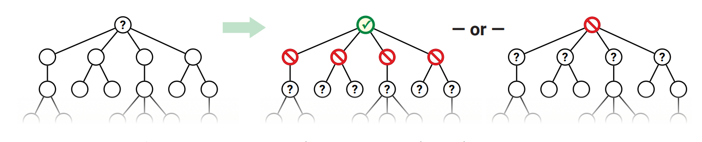 \(T\) の任意の頂点 \(v\) に対して、\(v\) を根とする部分木の最大独立集合を \(\mathit{MIS}(v)\) と書くことにします。 \(v\) を根とする部分木の独立集合で \(v\) を含まないものは、\(v\) の子を根とする部分木の独立集合の和集合です。また \(v\) を根とする部分木の独立集合で \(v\) を含むものには \(v\) の子が含まれず、\(v\) の孫を根とする部分木の独立集合の和集合に \(v\) を加えたものとなります。以上の観察から、\(\mathit{MIS}\) は次の再帰方程式に従います。ここで \(w \downarrow v\) という標準的でない記法は「\(w\) は \(v\) の子である」を意味します。 \[ \mathit{MIS}(v) = \max \left\lbrace \sum_{w \downarrow v} \mathit{MIS}(w), 1 + \sum_{w \downarrow v} \sum_{x \downarrow w} \mathit{MIS}(x) \right\rbrace \]