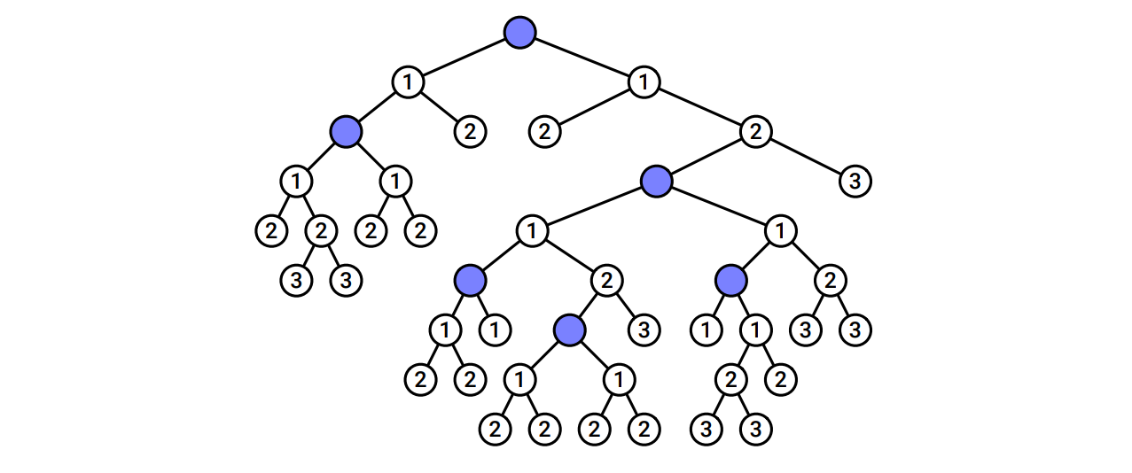 根付き木の全ての頂点にメッセージを送りたいとします。最初にメッセージを知っているのは根の頂点だけで、各ラウンドでメッセージを知っている頂点は最大で一つの子にメッセージを送ることができます。例を次に示します: