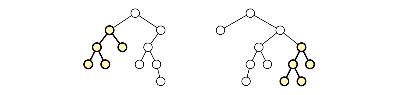 \(T\) を \(n\) 頂点の根付き二分木、\(k \leq n\) を正の整数とします。 \(T\) の頂点のうち \(k\) 個に印をつけて、全ての頂点のなるべく近い祖先に印をつけた頂点があるようにしたいとします。きちんと言うと、\(T\) の頂点の部分集合 \(K\) に対するクラスタリングコストを次のように定義し、これを最小化します: \[ \mathit{cost}(K) = \max\limits_{v} \mathit{cost}(v, K) \] ここで \(\max\) は木に含まれる全ての頂点に関する最大値を表し、\(\mathit{cost}(v, K)\) は \(v\) から \(K\) に含まれる一番近い \(v\) の先祖までの距離です: \[ \mathit{cost}(v, K) = \begin{cases} 0 & \text{if } v \in K \\ \infty & \text{if } v \text{ が } T \text{ の根でかつ } v \notin K \\ 1 + \mathit{cost}(\mathit{parent}(v)) & \text{それ以外} \end{cases} \] この定義から、\(K\) が \(T\) の根を含まないならば \(\mathit{cost}(K) = \infty\) であることが分かります。